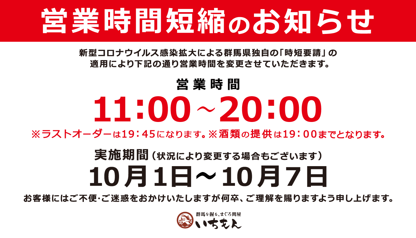 お知らせ 2021.10.01 営業時間短縮のお知らせ 重要なお知らせ 10月1日(金)~10月7日(木)までの期間中、「群馬を握る、まぐろ問屋いちもん」全店舗にて、 通常20:45閉店を20:00閉店とする時短営業を実施いたします。 また、酒類の提供は19:00までとさせていただきます。 お客様にはご不便をおかけしますが何卒ご理解とご協力の程よろしくお願い申し上げます。 お知らせ一覧へ戻る