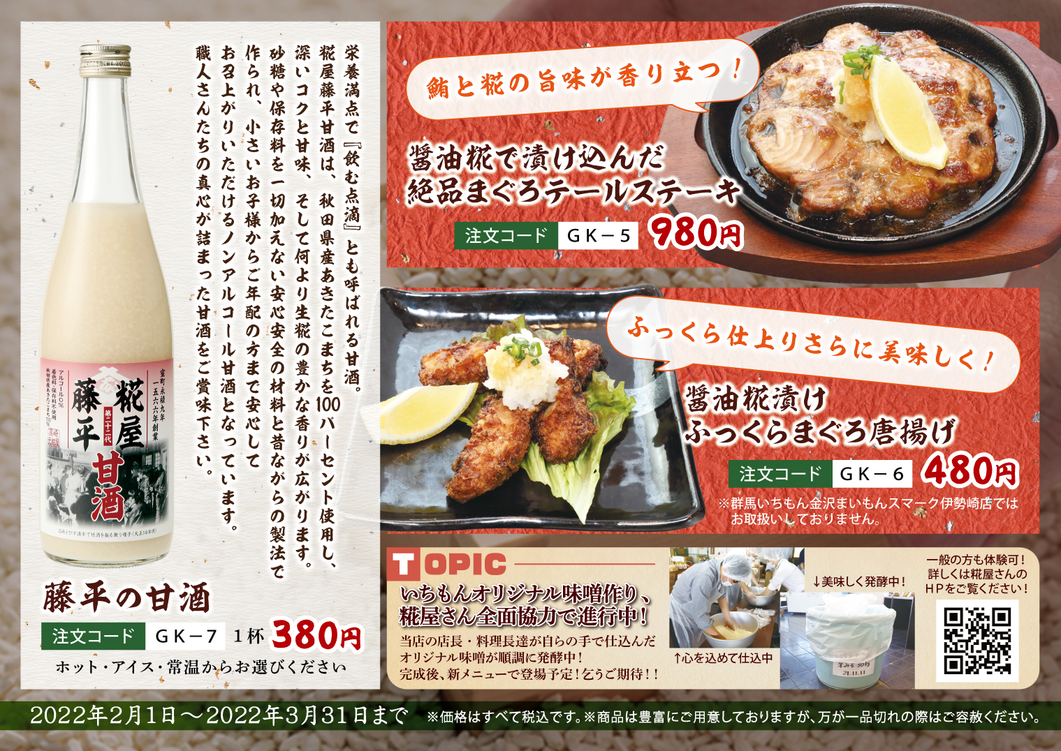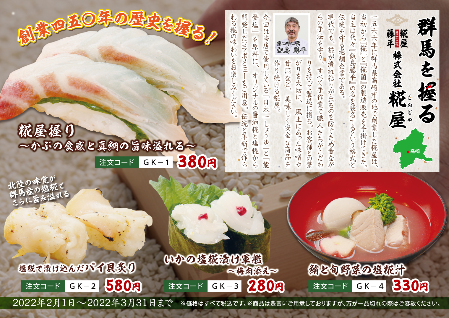 お知らせ 2022.01.31 創業450年の歴史を味わう!群馬を握る「糀屋」2/1(火)~3/31(木) お知らせ 群馬を握る『糀屋』とのコラボ商品を本日から販売開始! 創業450年、伝統の手作りを守りながらも新商品開発にも積極的に取り組む同社。 今回は、当店で使用している「日本一しょうゆ」を原料に使用した醤油糀と 「能登塩」を原料に使用した塩糀を新たに開発していただきました! 糀の香りと深い旨みが加わりさらに美味しくなった寿司をご堪能ください。 お知らせ一覧へ戻る