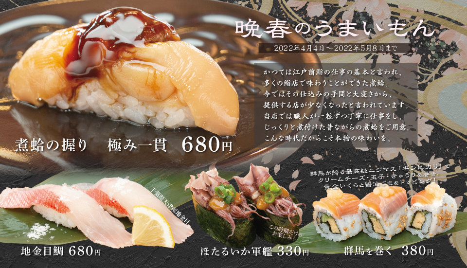 お知らせ 2022.04.03 期間限定メニュー「晩春のうまいもん」4/4~5/8販売 お知らせ 期間限定メニュー「晩春のうまいもん」スタート! かつては江戸前鮨の仕事の基本と言われた「煮蛤」。 今では仕込みの手間などから提供する店が少なくなったと言われています。 当店では、職人が一粒ずつ丁寧に仕事をし、じっくり煮付けてご用意します。 こんな時代だからこそ本物の味わいをぜひお楽しみください。 そのほか旬の金目鯛、ほたるいかや、群馬ブランドのギンヒカリなどをご用意! 晩春のうまいもんはいちもんで! お知らせ一覧へ戻る