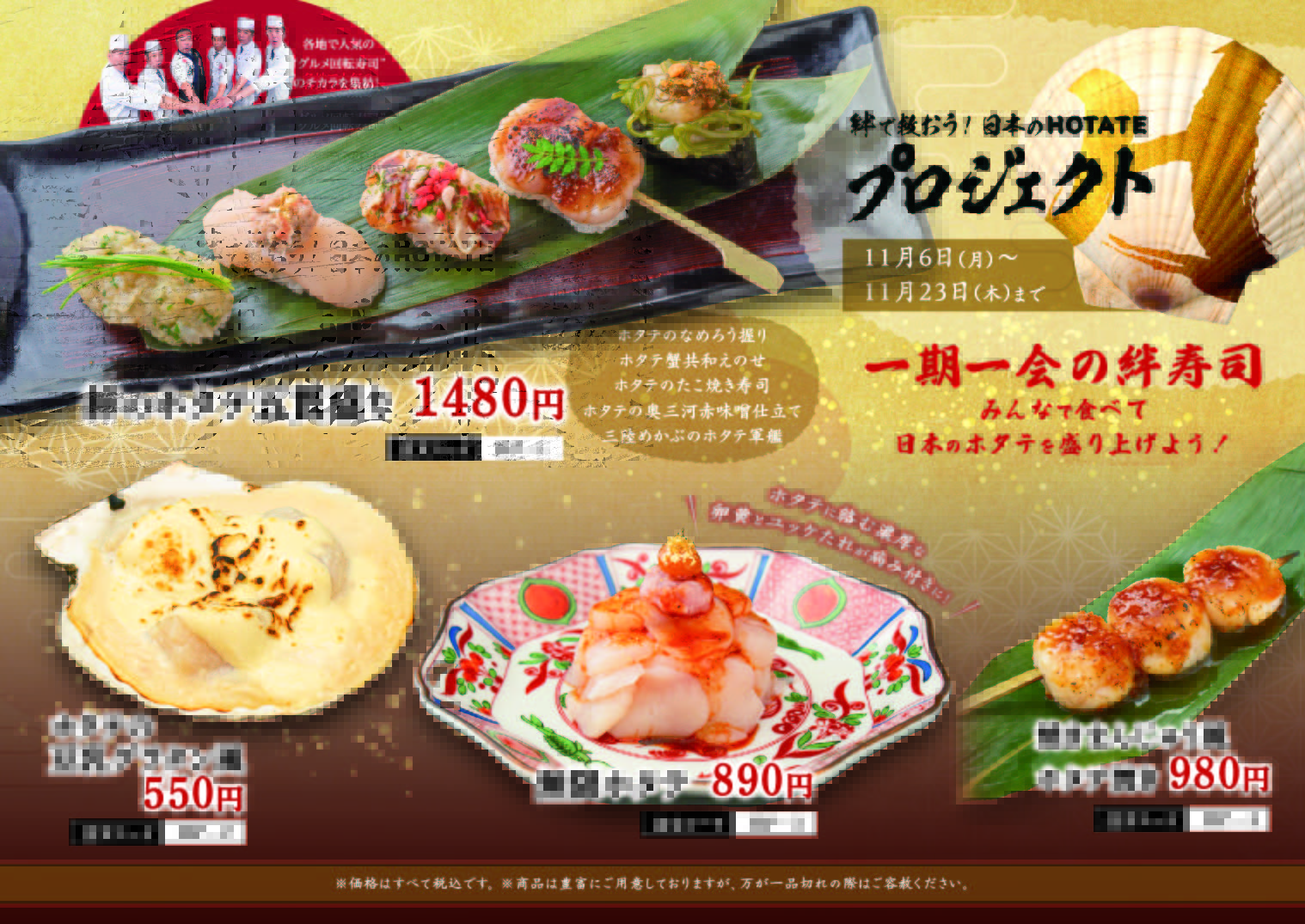 お知らせ 2023.11.06 日本のホタテプロジェクト 11/6~11/23 お知らせ群馬いちもん金沢まいもん群馬を握る、まぐろ問屋いちもん 各地で人気のグルメ回転寿司の力を集結して特別メニューをご用意致しました。 みんなで食べて日本のほたてを盛り上げよう!! お知らせ一覧へ戻る