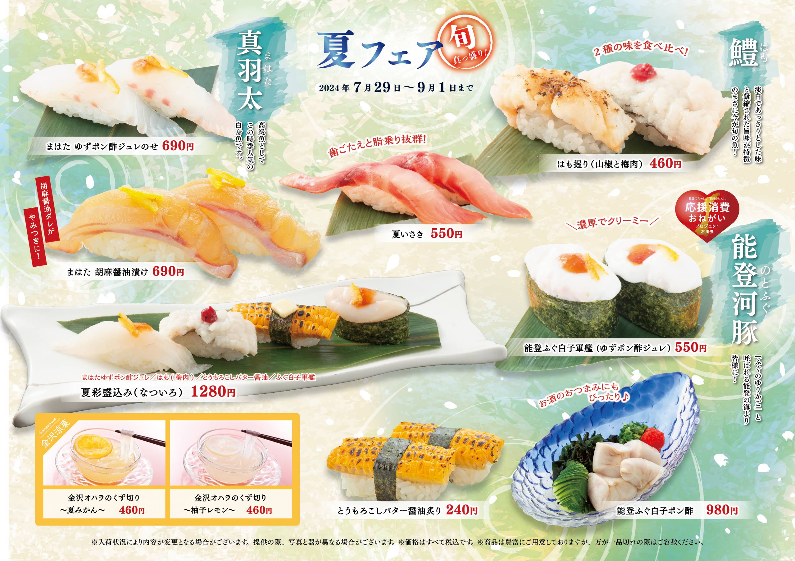 「はも」や「まはた」「ふぐ」など、珍しいネタを夏らしい味付けでご用意いたしました。