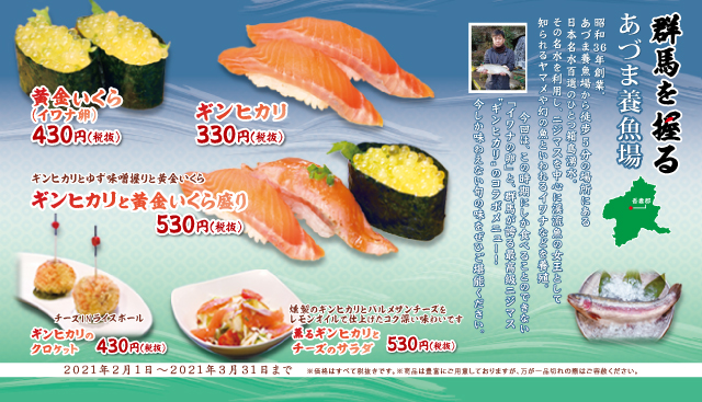 お知らせ 2021.02.08 いちもんがあづま養魚場とコラボ!2/1(月)~3/31(日)まで お知らせ 群馬を握る、あづま養魚場とのコラボ商品を本日から販売開始! この時期限定の黄金いくら(イワナ卵)に、群馬のブランド 最高級ニジマス″ギンヒカリ″を使用した商品をたくさんご用意してお待ちしております。 ぜひご堪能ください! お知らせ一覧へ戻る