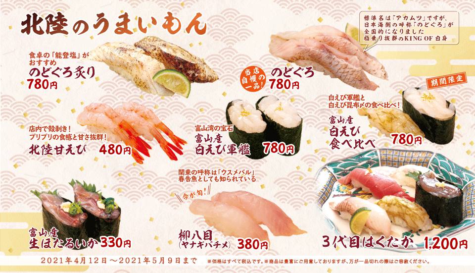 お知らせ 2021.04.12 期間限定!北陸のうまいもん 4月12日~5月9日まで お知らせ 高級魚のどぐろや、今が旬の柳八目(ヤナギバチメ)など 期間限定で北陸のうまいもんを沢山ご用意しております! ぜひご堪能ください お知らせ一覧へ戻る