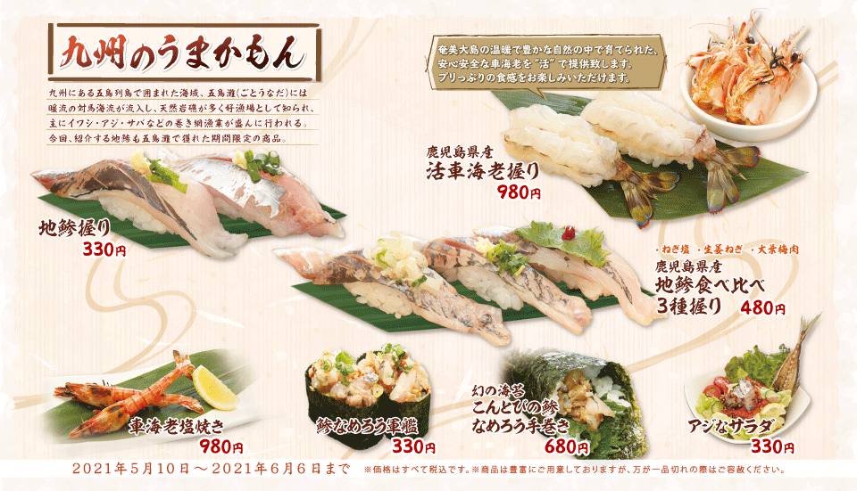 お知らせ 2021.05.10 期間限定!九州のうまかもん 5月10日~6月6日まで お知らせ 暖流の対馬海流が流入し、天然岩礁が多く好漁場として知られる五島灘(ごとうなだ)で獲れた 地鯵をメインにした寿司ネタをたくさんご紹介いたします。 また、奄美大島の温暖で豊かな自然の中で育てられた、安心安全な車海老も“活”でご提供いたします。 どれも期間限定の商品になりますのでどうぞご堪能ください。 お知らせ一覧へ戻る