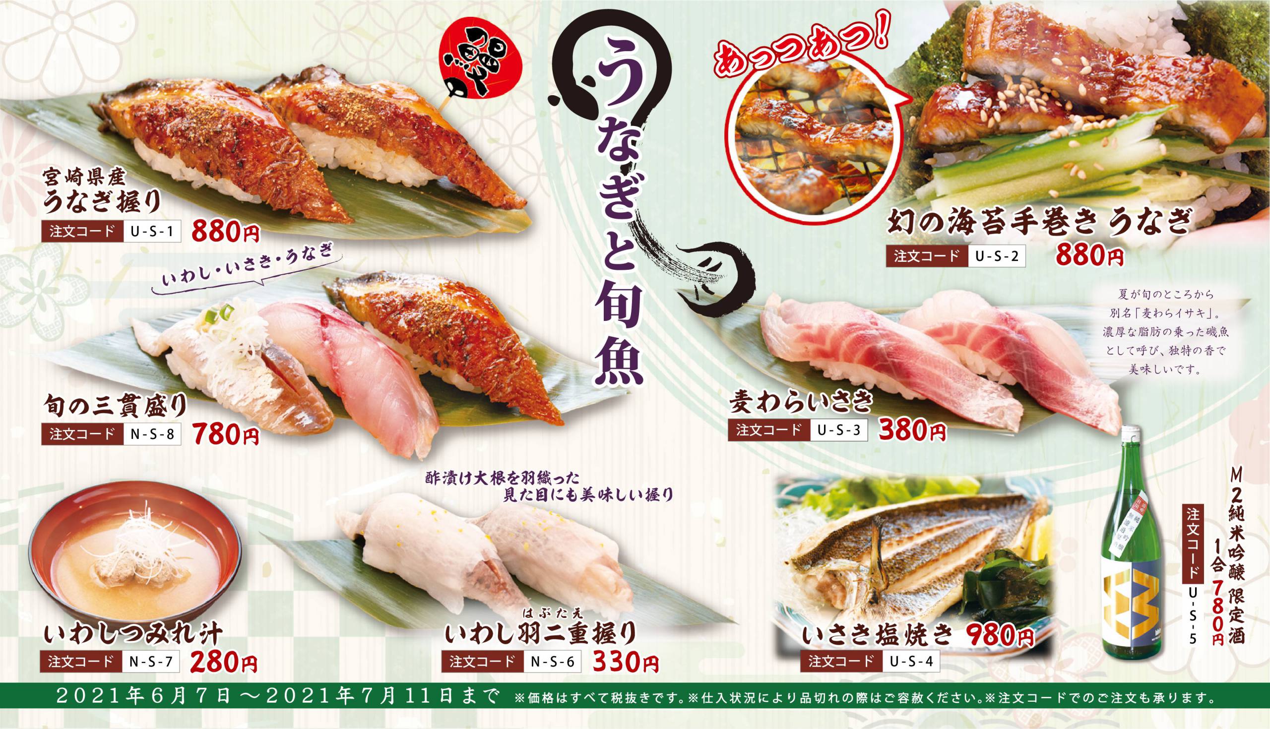 お知らせ 2021.06.07 期間限定!うなぎと旬魚 お知らせ 宮崎県産のうなぎ、夏が旬のいわし、麦わらいさきをご紹介します。 うなぎは高タンパクで多くのビタミンを含むため夏バテにはぴったりの食材です! 梅雨時期の今が旬の魚をぜひご堪能ください! ※まん延防止期間中はお酒の販売を休止しております。何卒ご理解とご協力の程よろしくお願い申し上げます。 お知らせ一覧へ戻る