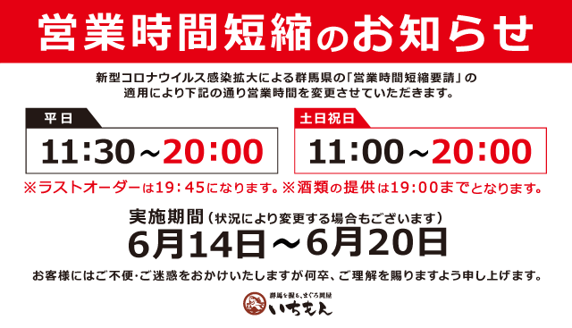 お知らせ 2021.06.14 営業時間短縮のお知らせ 重要なお知らせ 6月14日(月)~6月20日(日)までの期間中、「群馬を握る、まぐろ問屋いちもん」全店舗にて、 通常21:45閉店を20:00閉店とする時短営業を実施いたします。 また、酒類の提供は19:00までとさせていただきます。 お客様にはご不便をおかけしますが何卒ご理解とご協力の程よろしくお願い申し上げます。 お知らせ一覧へ戻る
